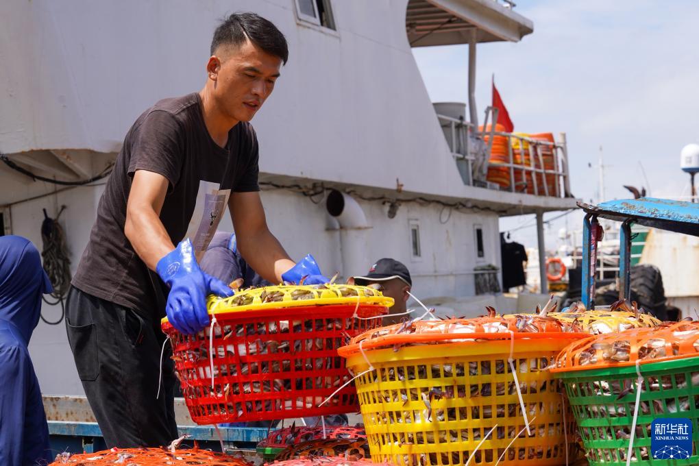 8月20日,船員在浙江省舟山市普陀區舟山國際水產(chǎn)城碼頭將一筐筐梭子蟹裝車(chē)。新華社發(fā)(鄒訓永 攝)