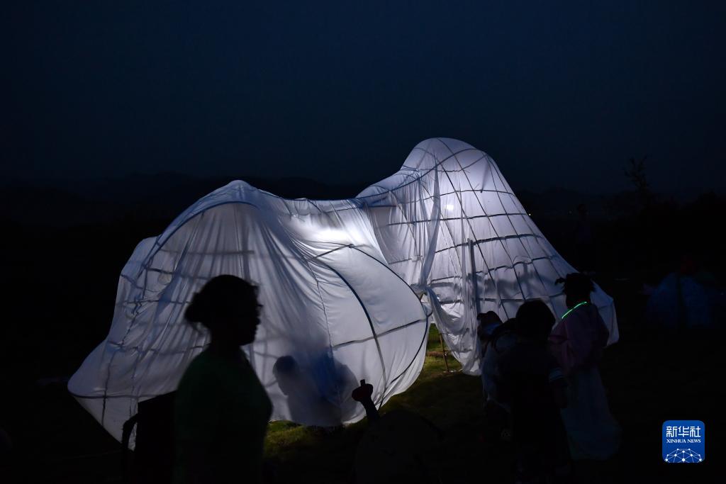 這是老師、志愿者和孩子們用樹(shù)枝、竹篾搭建的裝置藝術(shù)作品“云朵屋”(8月20日攝)。