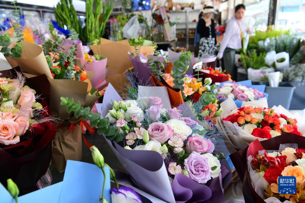 “七夕”將至,鮮花市場(chǎng)呈現俏銷(xiāo)勢頭,不少商家精心準備花卉產(chǎn)品,吸引顧客前來(lái)購買(mǎi)。