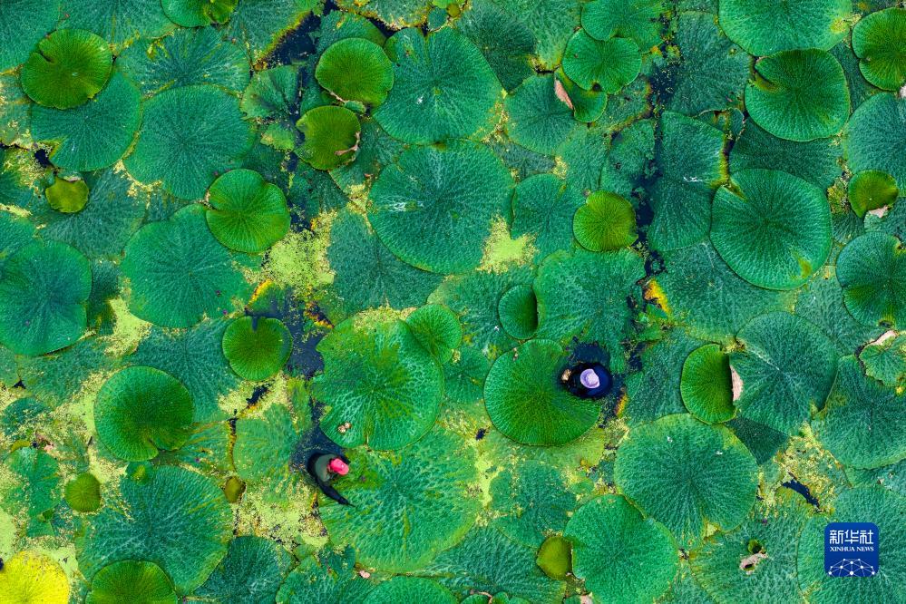 8月21日,江蘇省泰州市姜堰區顧高鎮申俞村農民在采收芡實(shí)(無(wú)人機照片)。