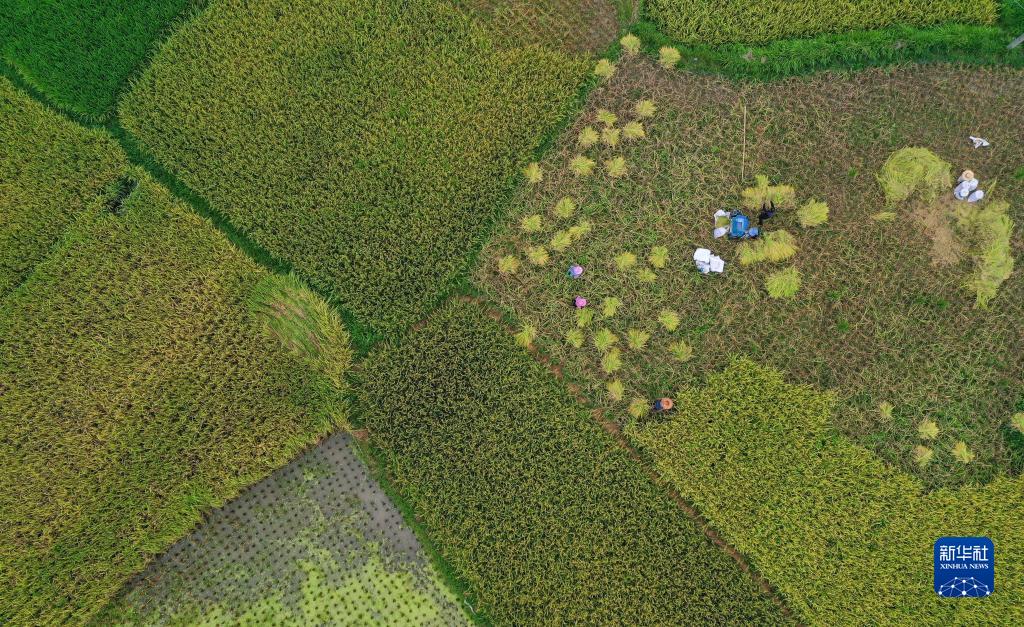 8月21日,村民在貴州省黔東南苗族侗族自治州從江縣剛邊壯族鄉平中村田間收獲水稻(無(wú)人機照片)。