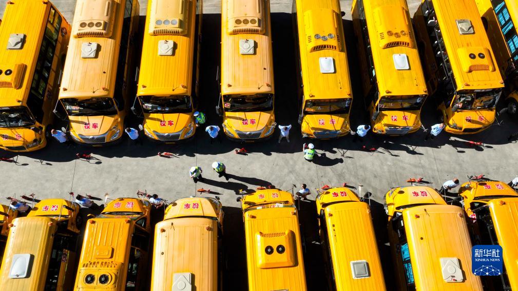 8月22日,民警在河北省遵化市一車(chē)輛檢測場(chǎng)檢查校車(chē)(無(wú)人機照片)。