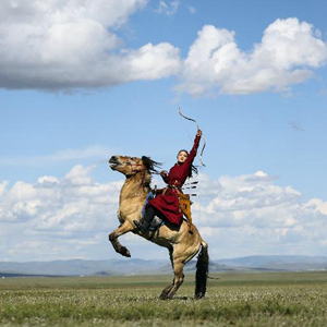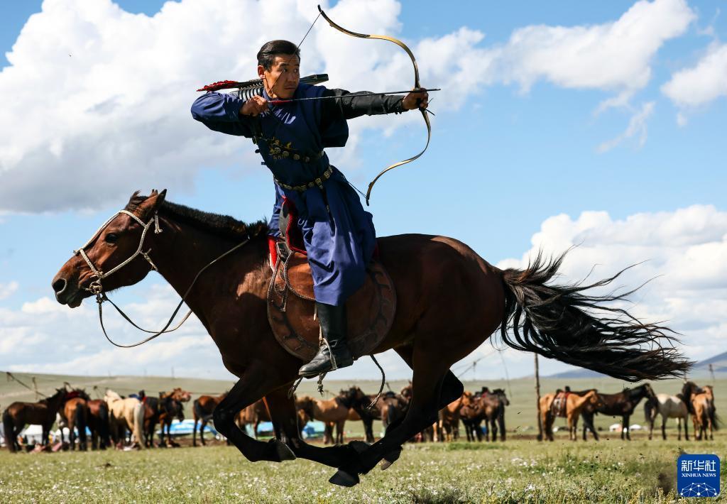 8月19日,在蒙古國泰吉山谷,選手在蒙古國“游牧民族”世界文化節上展示騎馬射箭。