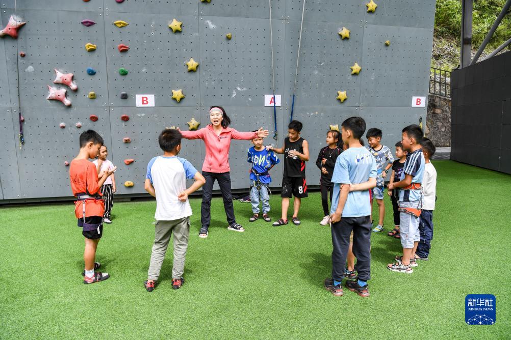 肖婷與前來(lái)學(xué)習攀巖的孩子互動(dòng)交流(2021年6月26日攝)。