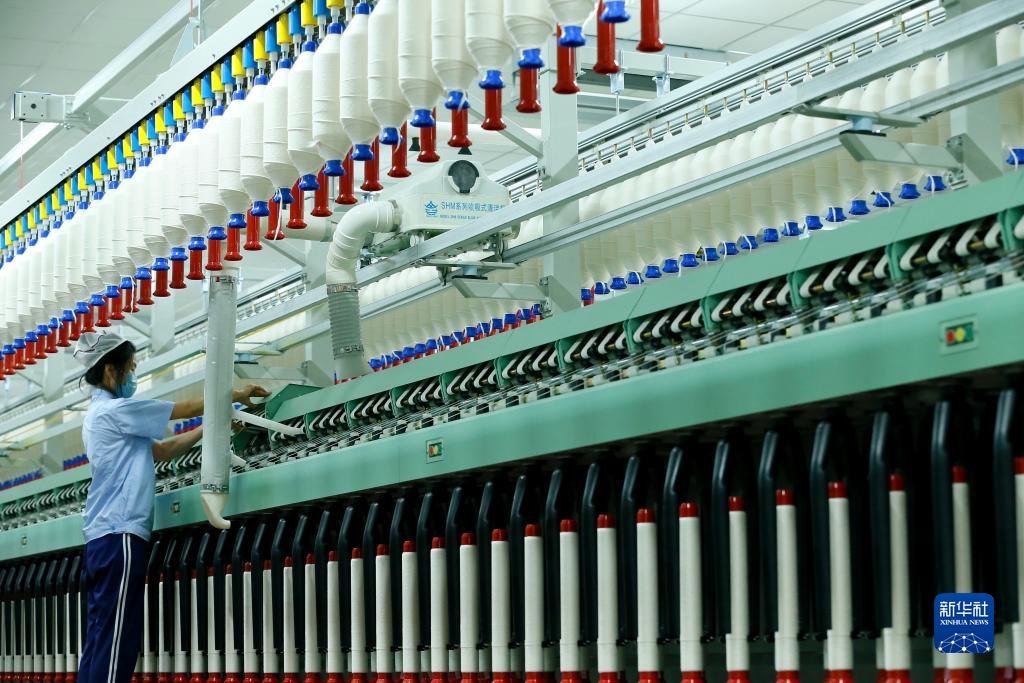 8月22日,青島即發(fā)盛寶紡織有限公司工人在數字化紡紗智能生產(chǎn)線(xiàn)上生產(chǎn)高端纖維。