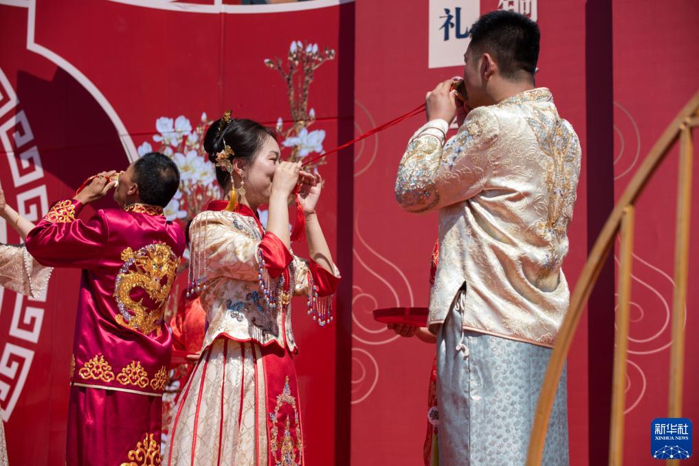 8月22日,新人們在集體婚禮儀式現場(chǎng)行合巹禮。