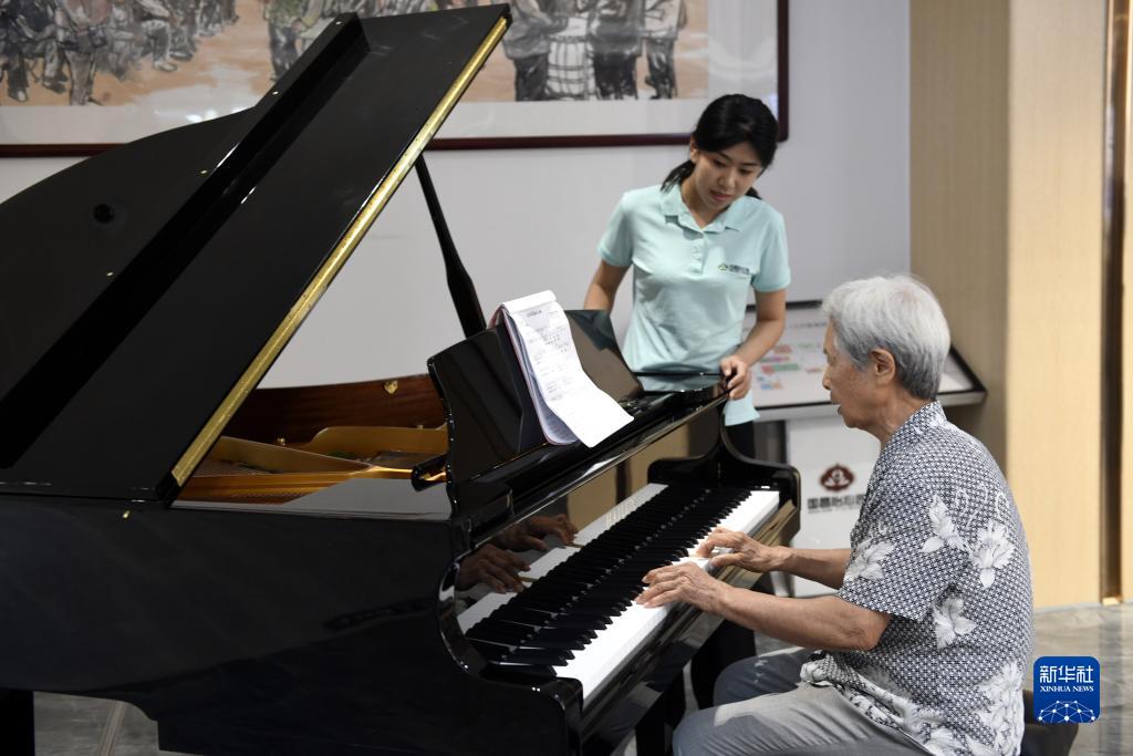 8月21日,90歲的邵琦老人(右)在山東省濱州市沾化區大高鎮國昌怡心園內演奏鋼琴。