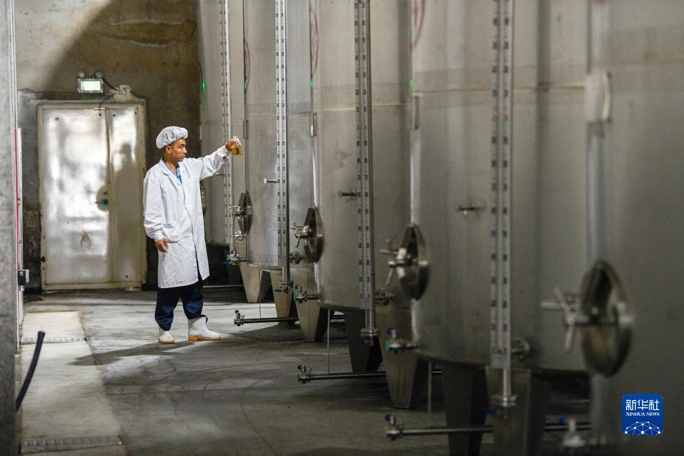 8月22日,在承德縣一家蘋(píng)果酒生產(chǎn)企業(yè),技術(shù)人員在熟化車(chē)間查看蘋(píng)果酒品質(zhì)。