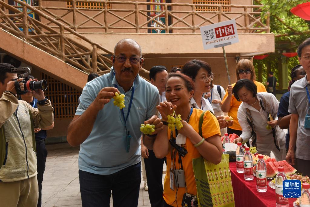 在新疆吐魯番葡萄溝景區,參訪(fǎng)團成員展示新疆瓜果(8月15日攝)。