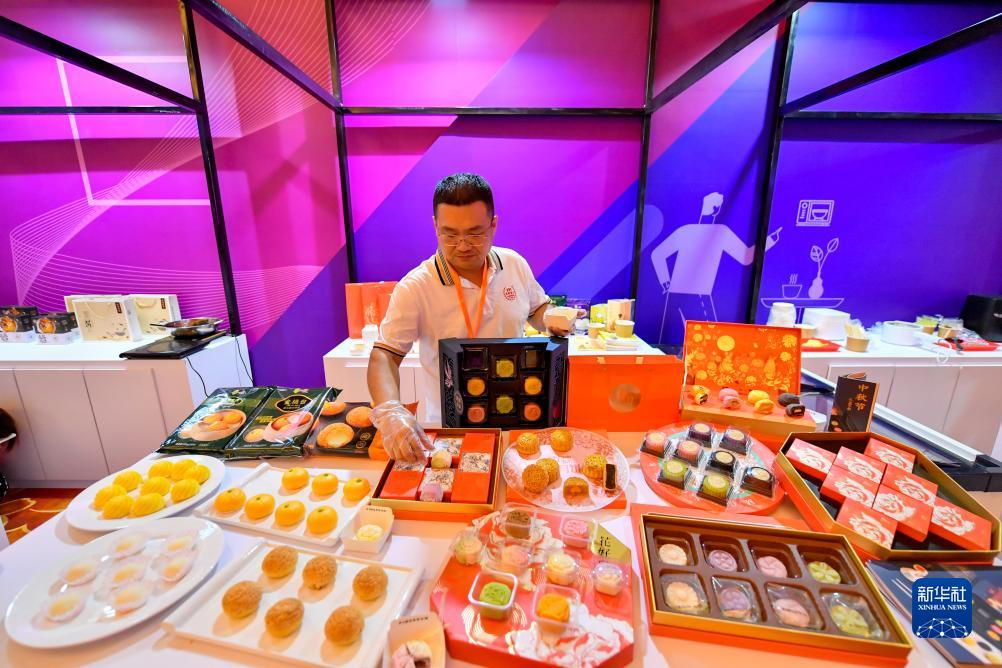 8月22日,參會(huì )商在2023天津臺企新品采購洽談會(huì )上擺放展品。
