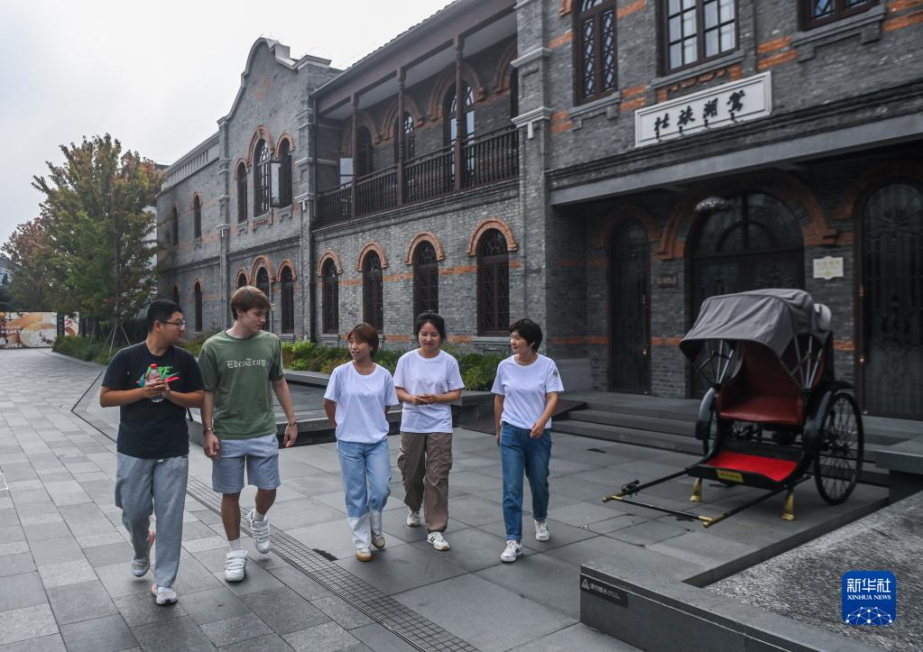 8月23日,在嘉興南湖邊,一名外教(左二)帶著(zhù)參加培訓的導游們模擬外國游客游覽過(guò)程中各種場(chǎng)景。