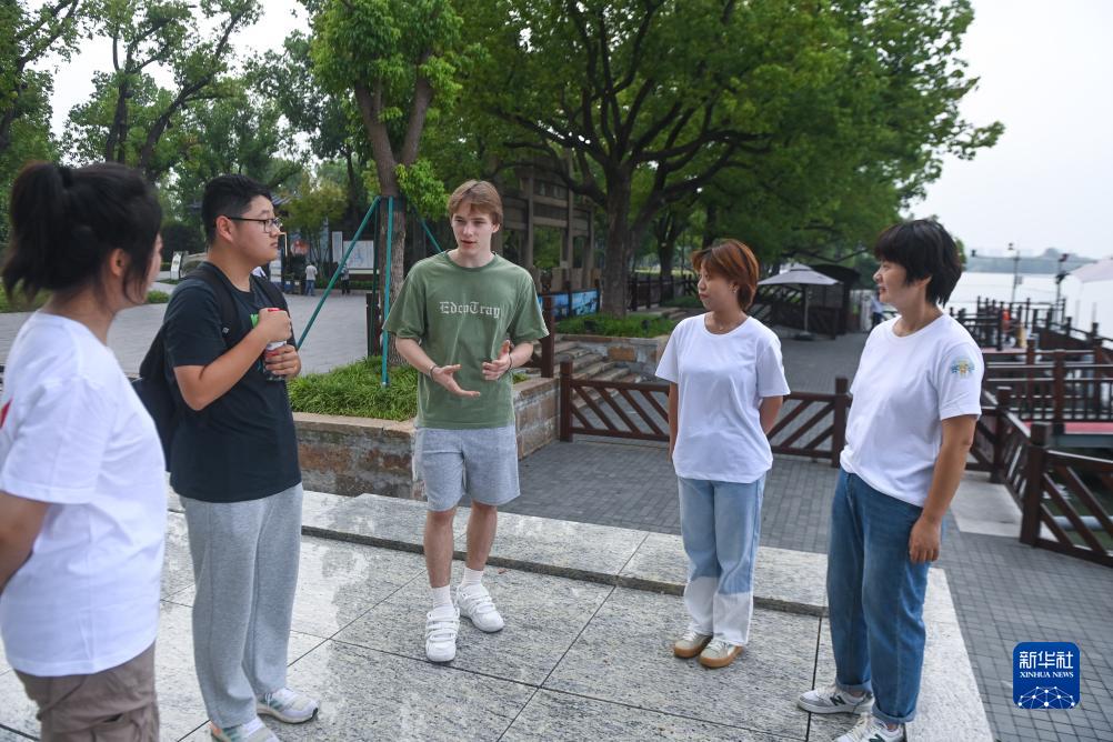 8月23日,在嘉興南湖邊,一名外教(左三)帶著(zhù)參加培訓的導游們模擬外國游客游覽過(guò)程中各種場(chǎng)景。