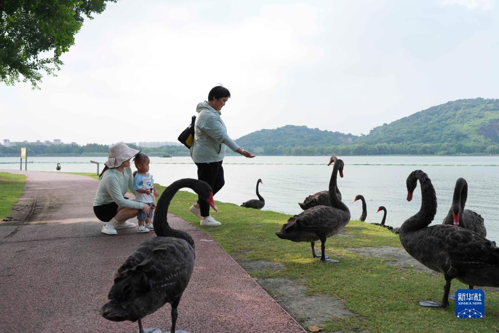 8月23日,游客在位于八里店鎮的西山漾國家城市濕地公園和棲息于此的黑天鵝互動(dòng)。