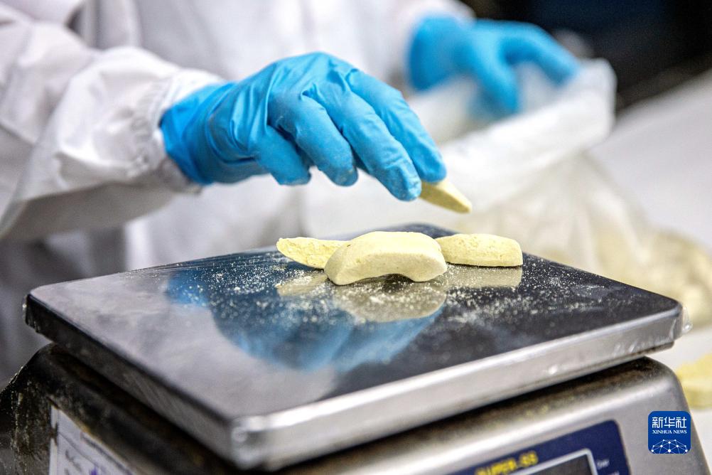 8月17日,在泰國尖竹汶府,尖竹汶果品公司工作人員稱(chēng)重榴蓮干。新華社記者 王騰 攝