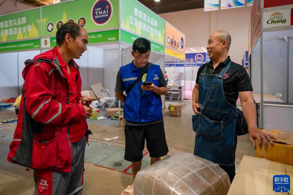 陳杰(右)在第七屆中國-南亞博覽會(huì )結束后與兩家快遞公司員工商量寄送快遞價(jià)格(8月20日攝)。新華社記者 陳欣波 攝