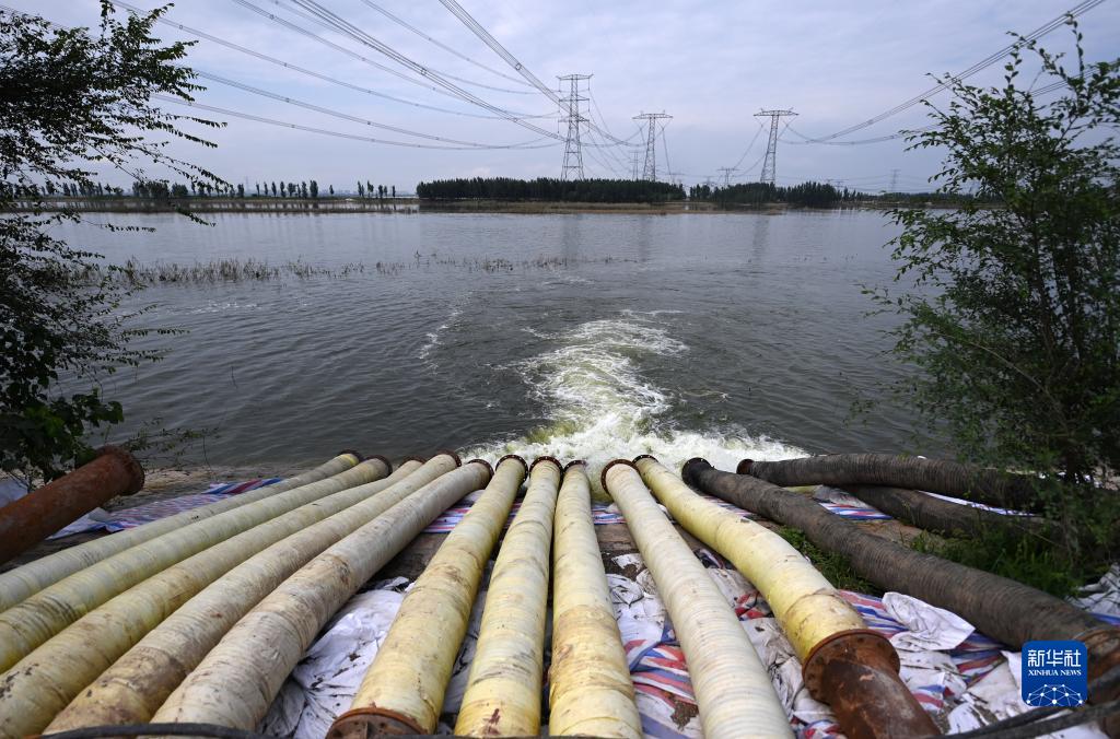 8月24日,大型抽水泵將天津市靜海區王口鎮茁頭排干渠西側農田內的積水抽排到大清河河道內。