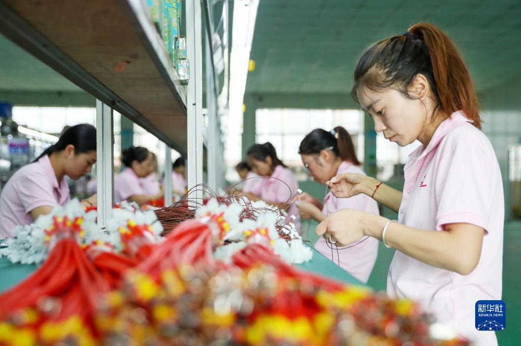 8月24日,四川省廣安華鎣山經(jīng)開(kāi)區一家電子企業(yè)的線(xiàn)束車(chē)間,員工在流水線(xiàn)上作業(yè)。