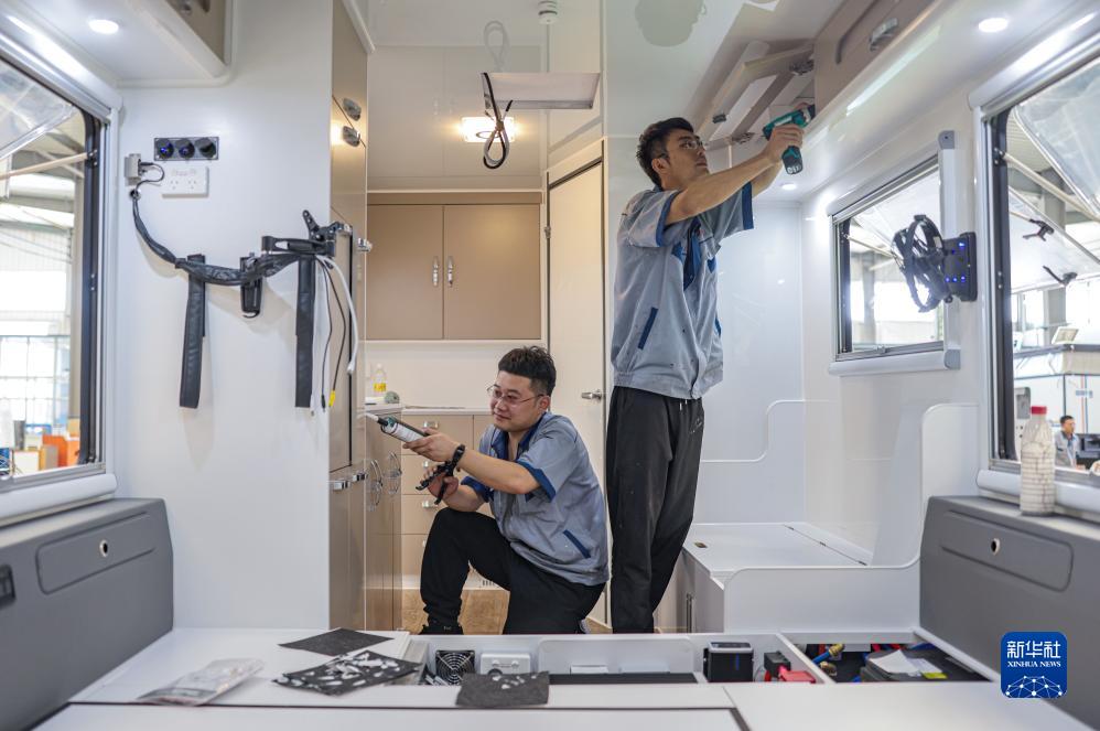 8月24日,山東省榮成市一家房車(chē)制造企業(yè)的工人在安裝房車(chē)組件。