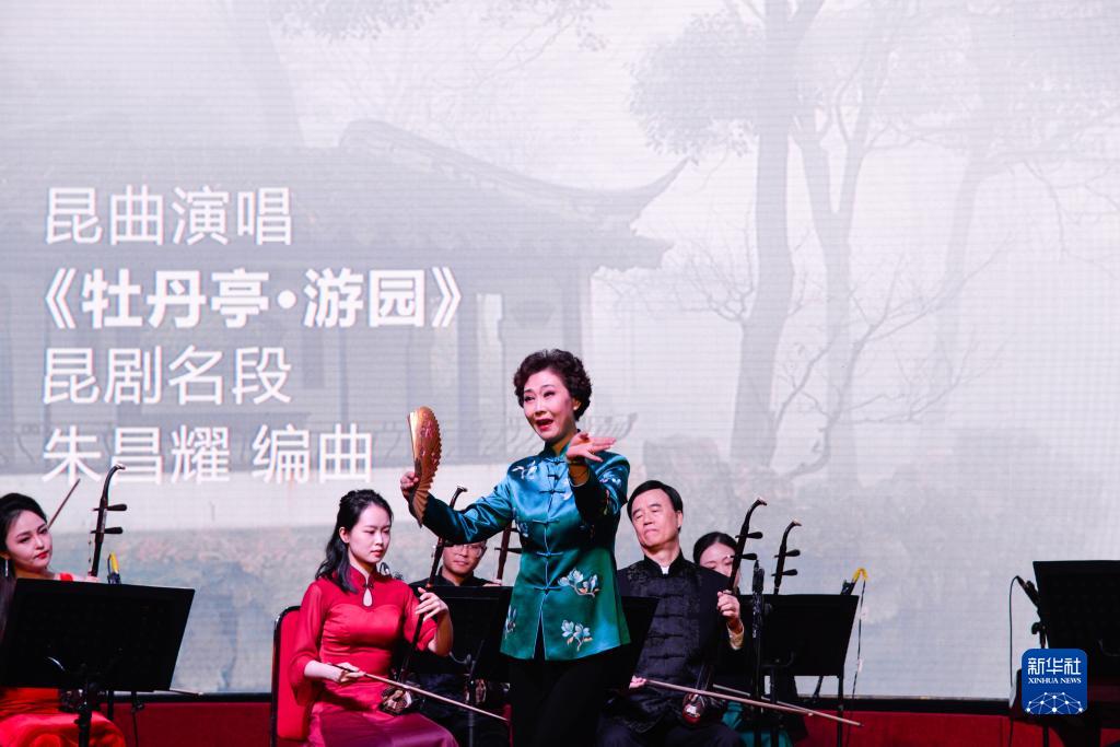 8月24日,在印度尼西亞雅加達太陽(yáng)城,表演者演唱昆曲《牡丹亭·游園》。