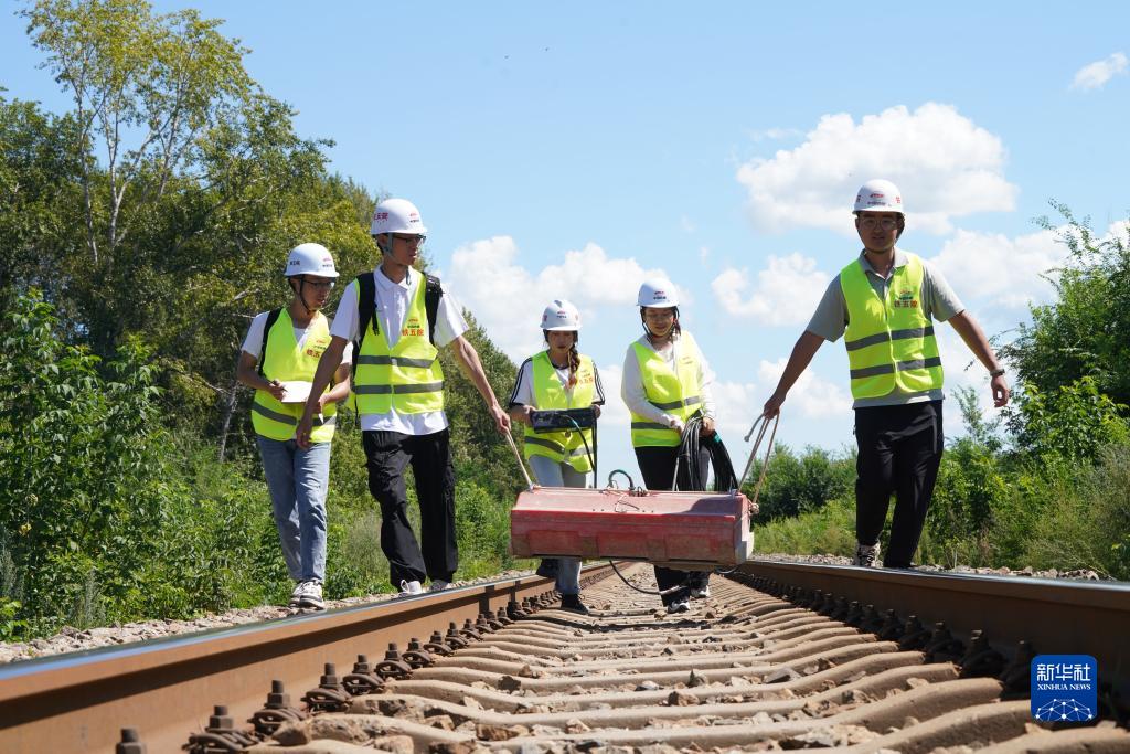 在黑龍江省雙鴨山市集賢縣的鐵路沿線(xiàn),部分勘察班組成員在鐵路既有線(xiàn)開(kāi)展路基狀態(tài)檢測作業(yè)(8月24日攝)。