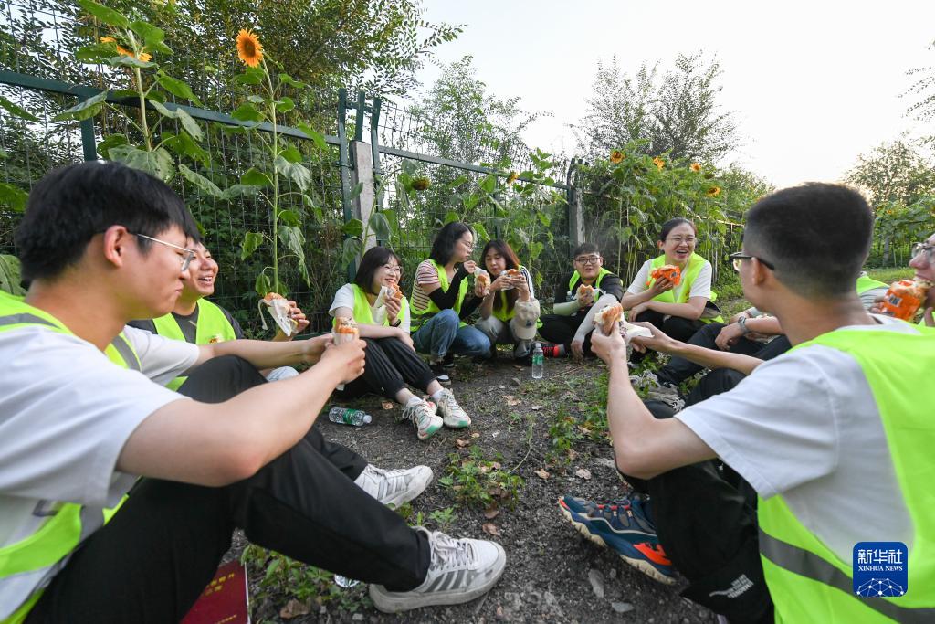 在黑龍江省雙鴨山市集賢縣的鐵路沿線(xiàn)旁一空地,勘察班組成員在工閑時(shí)吃飯休息(8月24日攝)。