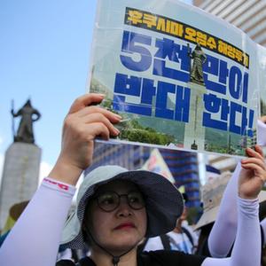 8月25日,在韓國首爾光化門(mén)廣場(chǎng),人們手持標語(yǔ)抗議日本核污染水排海。