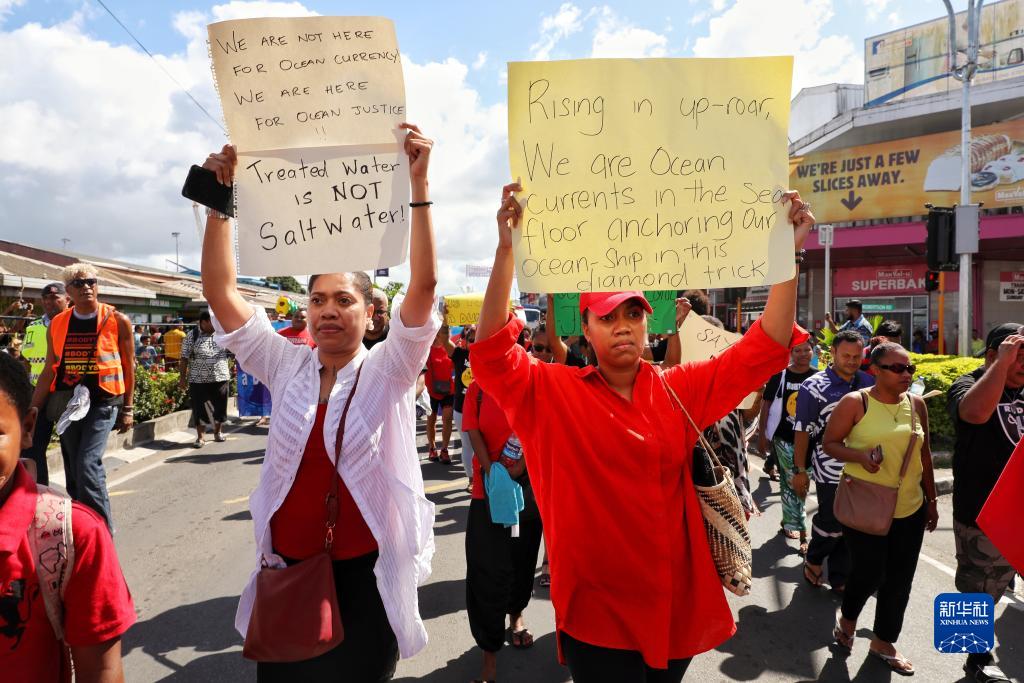 當日,數百名斐濟民眾沿街游行,強烈抗議日本政府啟動(dòng)福島第一核電站核污染水排海,呼吁國際社會(huì )采取行動(dòng)保護太平洋生態(tài)和子孫后代的福祉。
