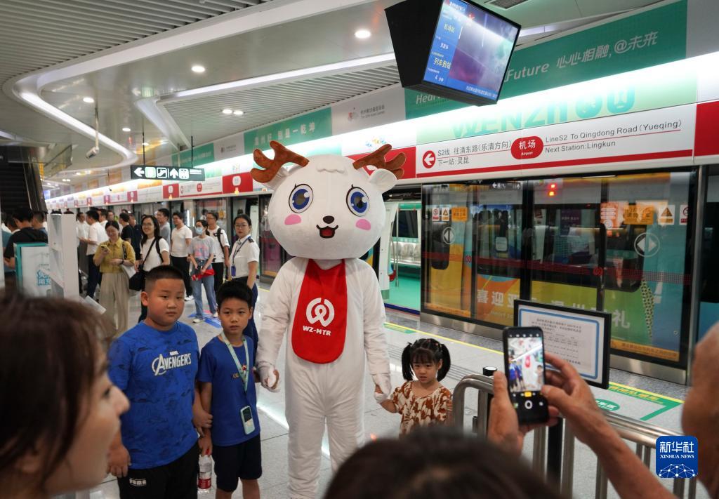 8月26日,在溫州S2線(xiàn)機場(chǎng)站,乘客在與吉祥物合影。