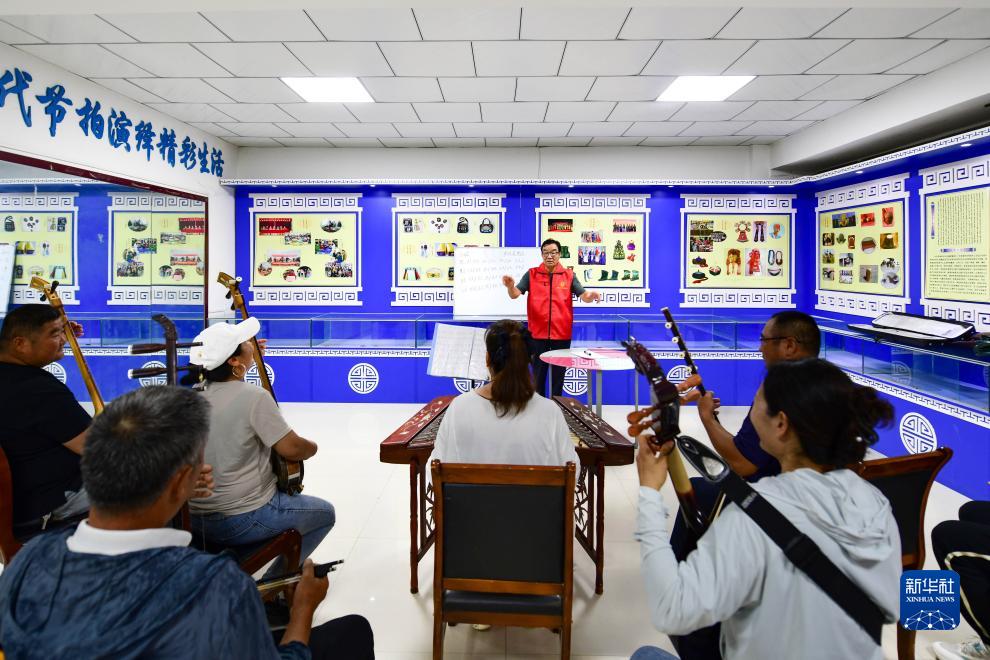 8月26日,在鄂托克前旗上海廟鎮阿勒臺嘎查文化活動(dòng)中心美育課堂上,志愿者額爾肯吉日嘎拉指導農牧民練習演奏樂(lè )曲。