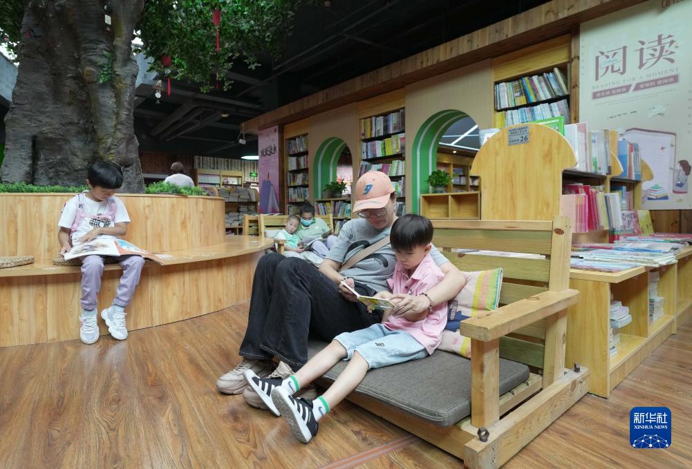 8月26日,家長(cháng)帶著(zhù)孩子在秦皇島市海港區青年書(shū)店閱讀區閱讀。