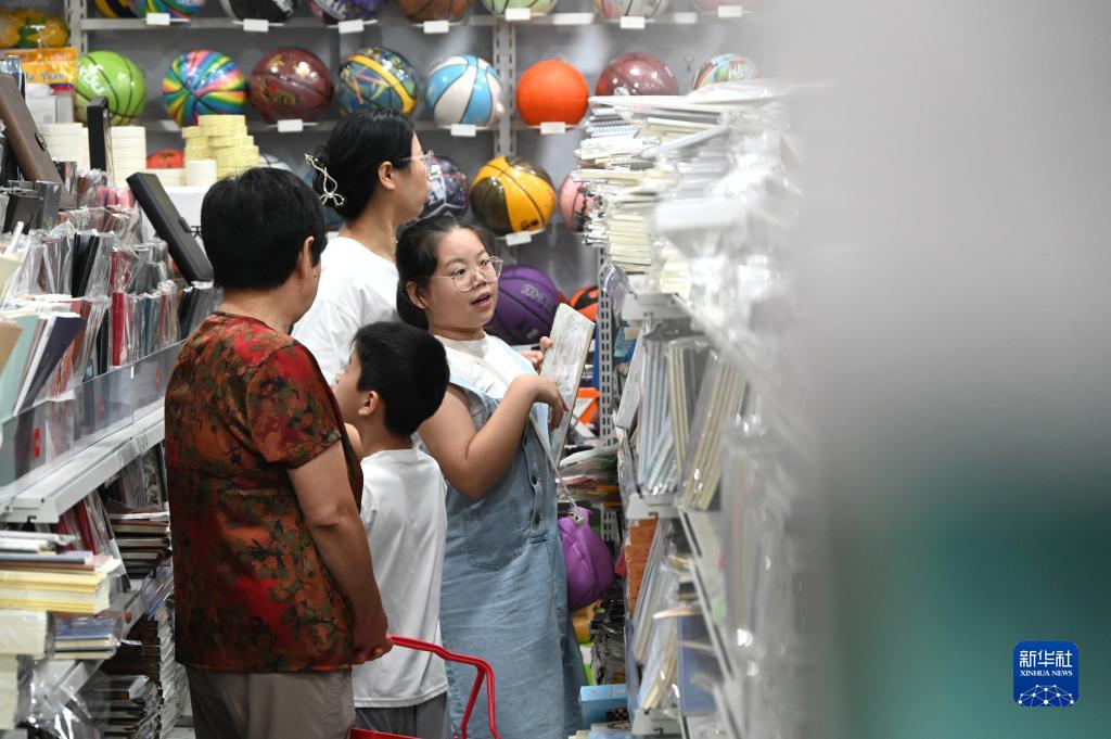 8月26日,在河南省開(kāi)封市一家文具店內,學(xué)生和家長(cháng)在挑選文具。