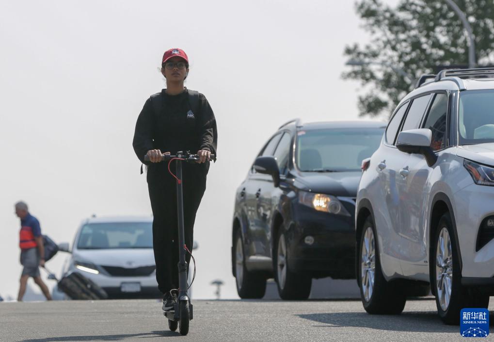 8月26日,在加拿大溫哥華,一名女子騎著(zhù)電動(dòng)滑板車(chē)在煙霧籠罩的街道上行駛。