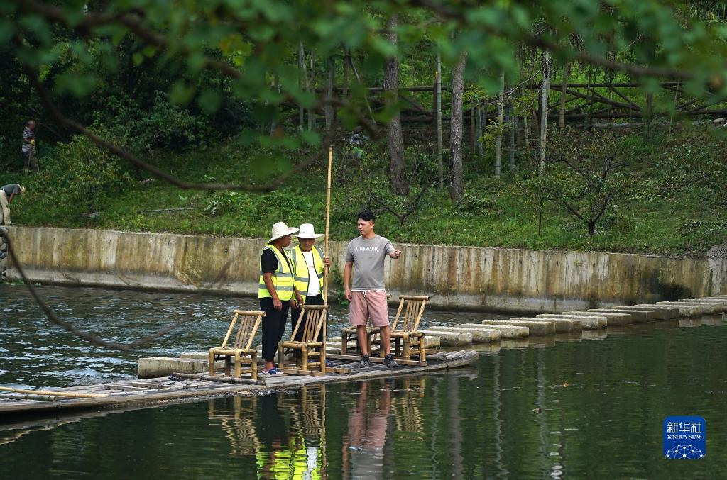 包希孟(右一)和漂流旅游項目的筏工交流(8月24日攝)。