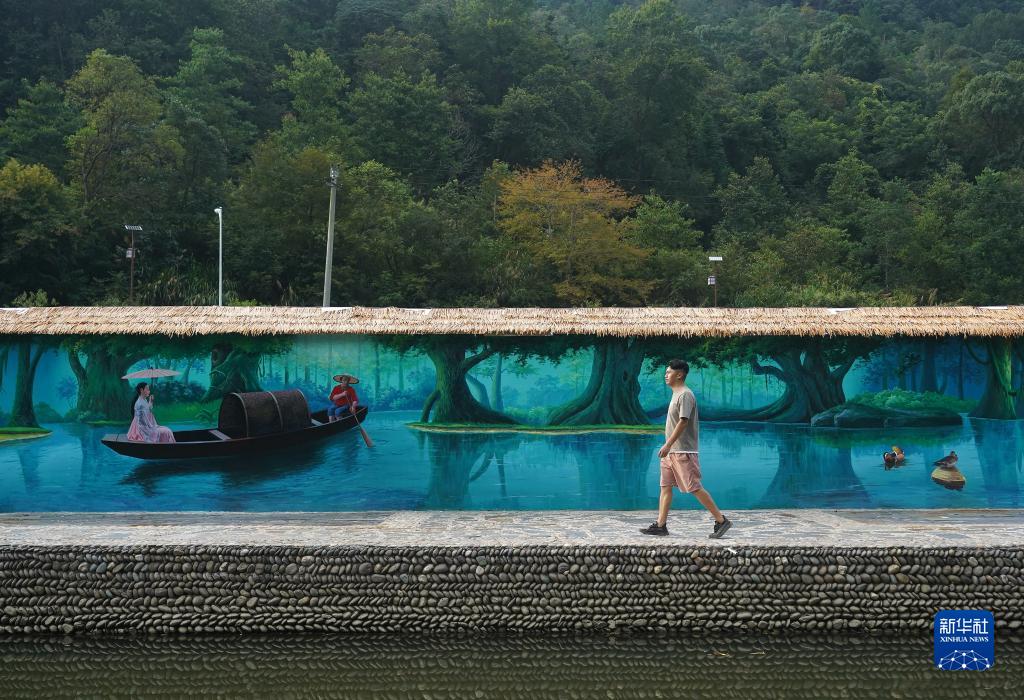 包希孟從生態(tài)泳池邊的彩繪墻前走過(guò)(8月24日攝)。