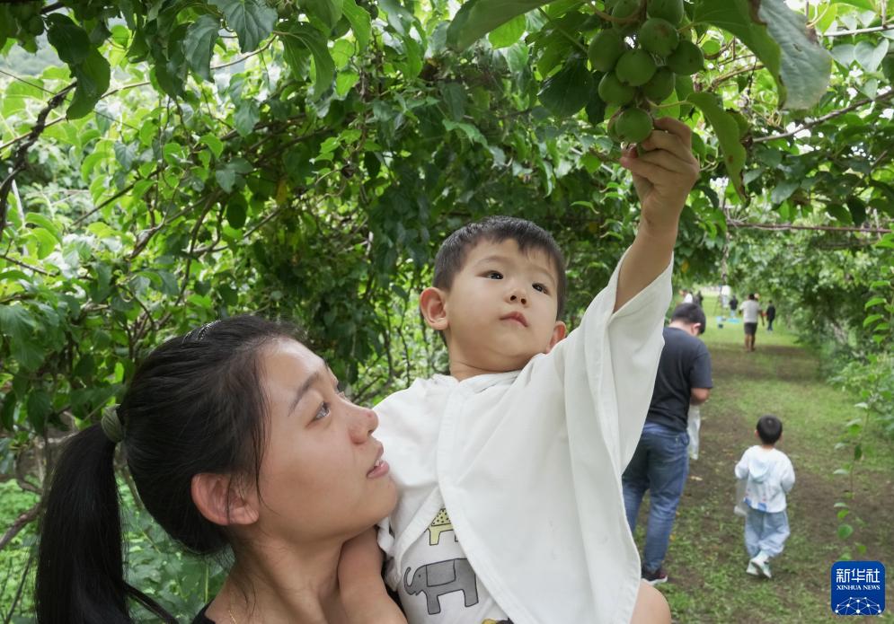 8月26日,游客帶著(zhù)孩子在秦皇島市海港區駐操營(yíng)鎮花廠(chǎng)峪村軟棗獼猴桃種植基地采摘軟棗獼猴桃。