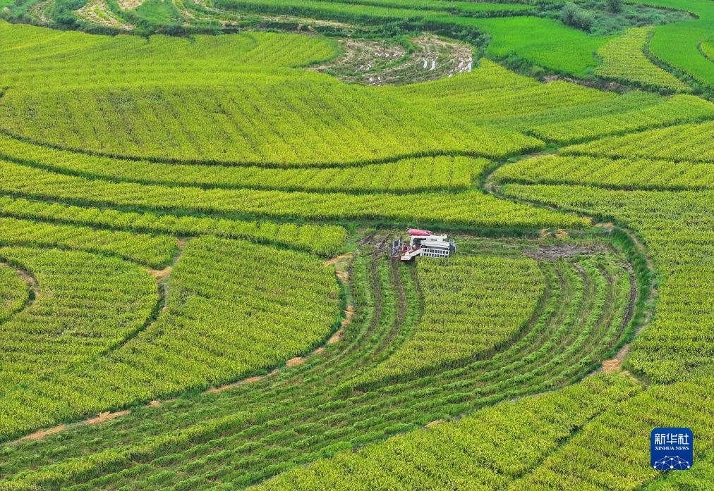 8月26日,農機手駕駛收割機在貴州省岑鞏縣水尾鎮新場(chǎng)村收割制種水稻(無(wú)人機照片)。