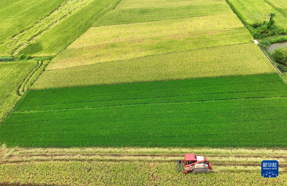 8月27日,在湖南省衡陽(yáng)市衡陽(yáng)縣臺源鎮,農機手駕駛收割機在收割稻谷(無(wú)人機照片)。