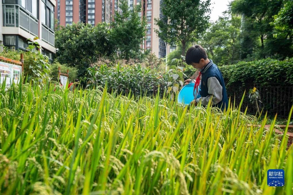 8月27日,云南省昆明市潤城學(xué)校的學(xué)生在勞動(dòng)體驗實(shí)踐基地給稻田澆水。