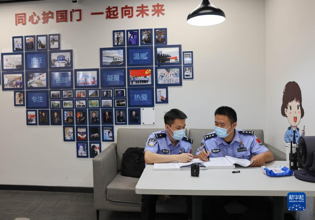 8月24日,在首都機場(chǎng)3號航站樓邊檢執勤現場(chǎng)備勤室,兩位移民管理警察在交流專(zhuān)業(yè)知識和實(shí)操技能。