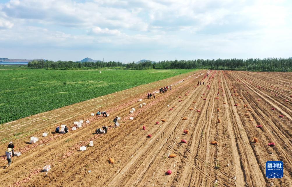 8月28日,灤州市九百戶(hù)鎮一家鮮食紅薯種植合作社的社員在田間收獲煙薯(無(wú)人機照片)。