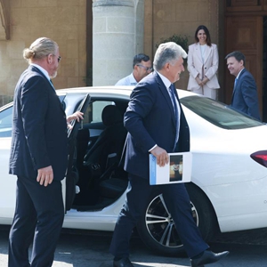 8月28日,在塞浦路斯尼科西亞,聯(lián)合國負責歐洲、中亞和美洲事務(wù)的助理秘書(shū)長(cháng)米洛斯拉夫·延?。ㄇ爸校┡c塞浦路斯希臘族領(lǐng)導人、總統赫里斯托祖利季斯(前右)舉行會(huì )談。