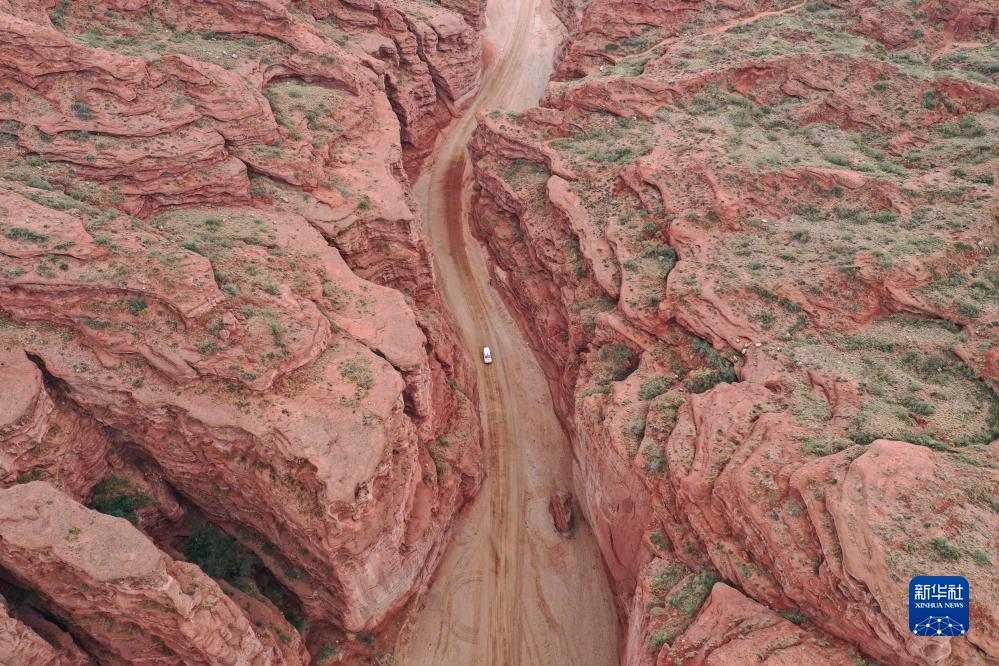 參與2023年環(huán)塔拉力賽的賽車(chē)疾馳在新疆阿克蘇地區溫宿縣大峽谷(5月21日攝,無(wú)人機照片)。
