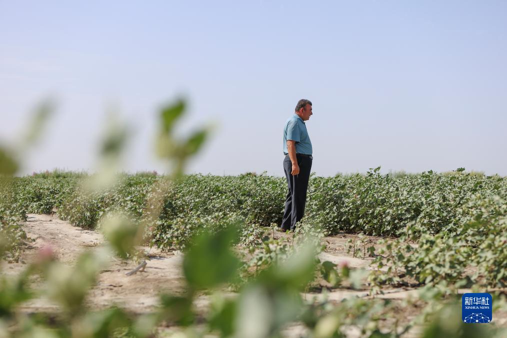 新疆尉犁縣巴西買(mǎi)里村,棉農爾肯·熱衣木在棉田中查看棉花坐桃情況(8月17日攝)。