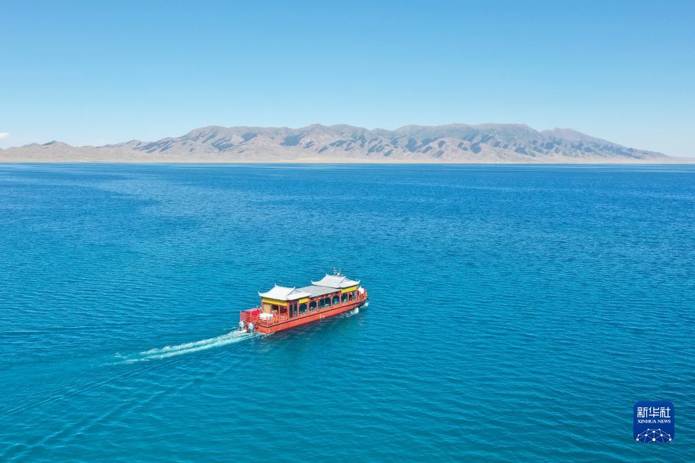 游客乘坐游船在新疆賽里木湖游覽(7月25日攝,無(wú)人機照片)。