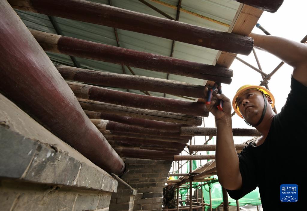 8月29日,工人在李大釗故居維修保護工程工地施工。