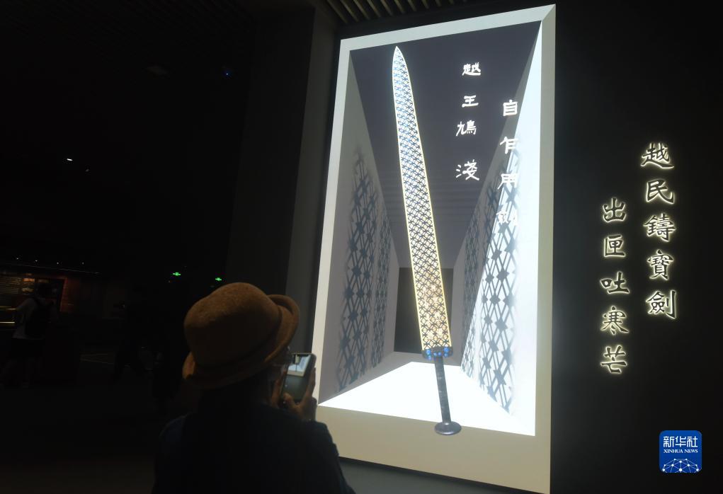 8月29日,參觀(guān)者在浙江省博物館新館觀(guān)看利用裸眼3D技術(shù)展示的越王者旨於睗劍。