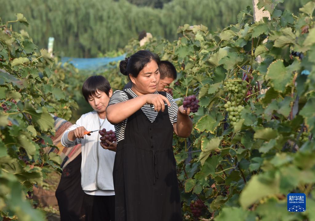 8月30日,邢臺市威縣戚霍寨村一家庭農場(chǎng)果農在采摘葡萄。
