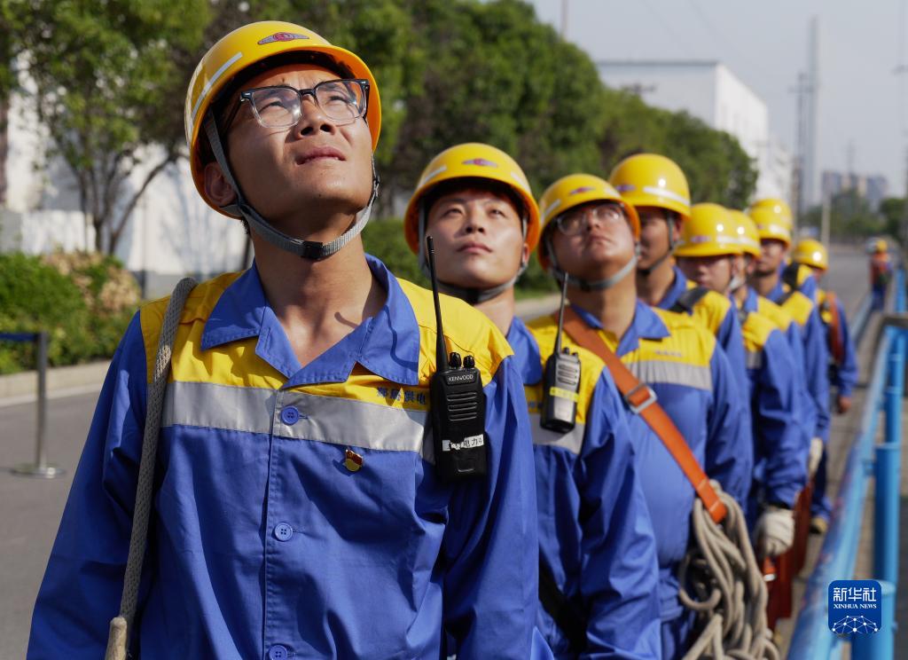 8月29日,中國鐵路鄭州局集團有限公司鄭州供電段工作人員在鄭州北站編組場(chǎng)內準備攀爬燈橋進(jìn)行檢修作業(yè)。