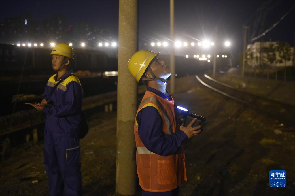 8月29日,在鄭州北站編組場(chǎng),中國鐵路鄭州局集團有限公司鄭州供電段工作人員在夜間對投光燈進(jìn)行巡查。