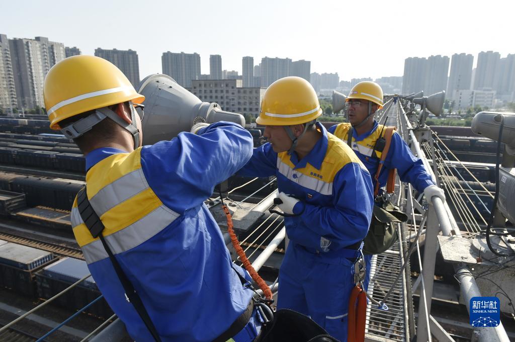 8月29日,中國鐵路鄭州局集團有限公司鄭州供電段工作人員在鄭州北站編組場(chǎng)的燈橋上檢修投光燈。